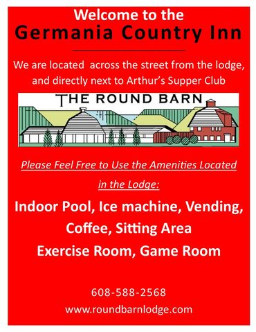 This hotel is located across the street from our sister location, the Round Barn Lodge, and is nestled between two restaurants; Arthur’s Supper Club, and Rumble Seats. We are surrounded by the natural beauty of the hills and valleys and the scenic Wisconsin river. We are within minutes from well-known destinations like Frank Lloyd Wrights Taliesin, (APT) American Players Theater and the House on the Rock. We offer 15 basic rooms with coffee makers, flat screen TV's, & cable. Guests of the Germania have full access to all the amenities of the Round Barn Lodge including the pool and game room area.