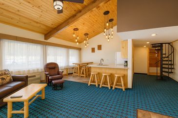 Two Story Family Suite with 1 king bedroom, 2 queen bedrooms, full kitchen, large fireplace, living & dining room. (room 100)